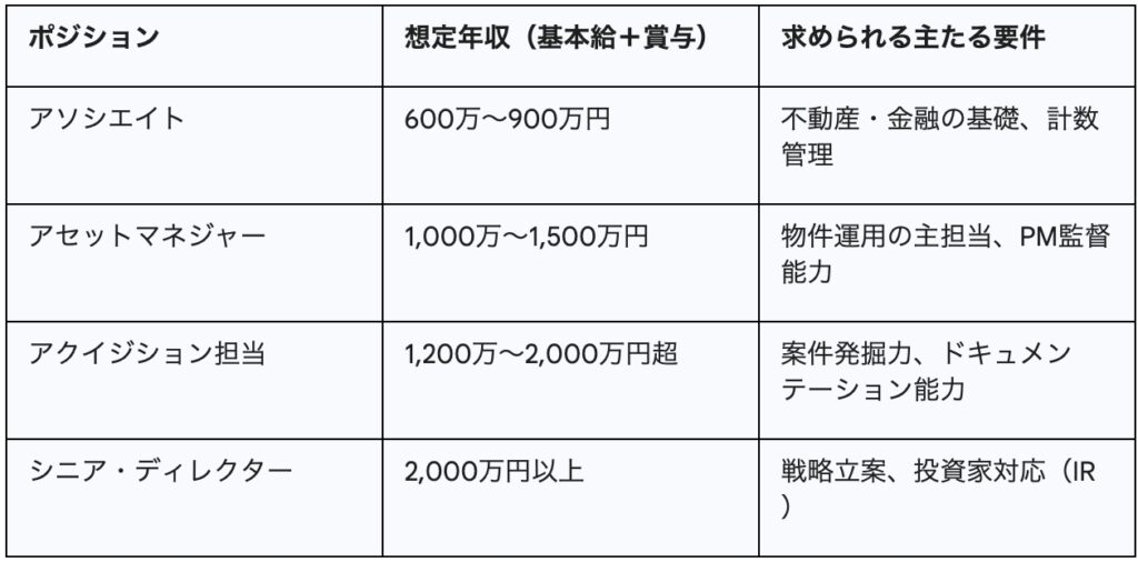報酬体系は、基本給に加えて業績に連動したボーナスの比率が高いのが特徴です。特にアクイジション(物件取得)部門では、多額の取引を成立させることで、年収が跳ね上がるケースも珍しくありません。