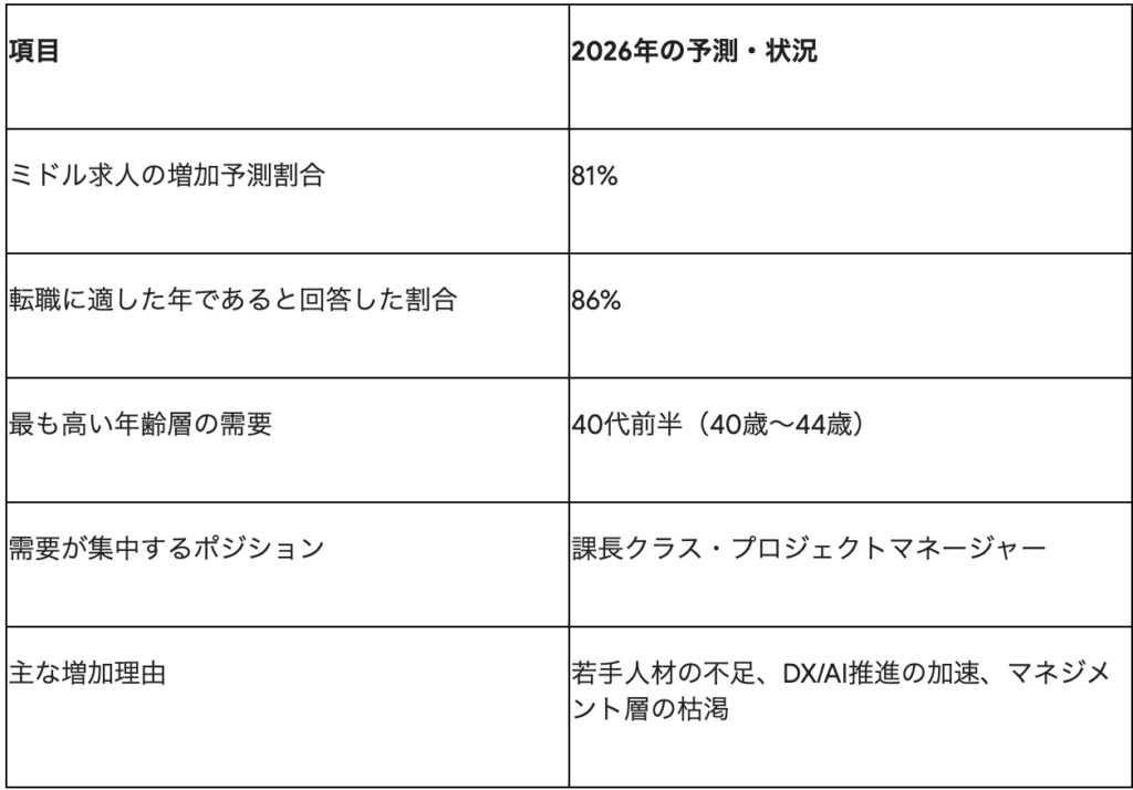 転職市場の最前線に立つコンサルタントたちの予測によれば、2026年は35歳から40代前半を対象とした求人が大幅に増加する見通しです。以下の表は、ミドル人材の求人動向に関する予測データをまとめたものです。
