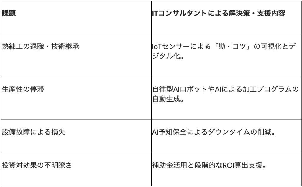 ITコンサルタントは、単にツールを導入するだけでなく、現場の職人の「暗黙知」をいかにデータとして抽出するか、という変革を支援することが求められます。このような「現場に寄り添うコンサルティング」は、製造業出身のエンジニアがコンサル業界へ転職する際、最も大きな強みとなります。