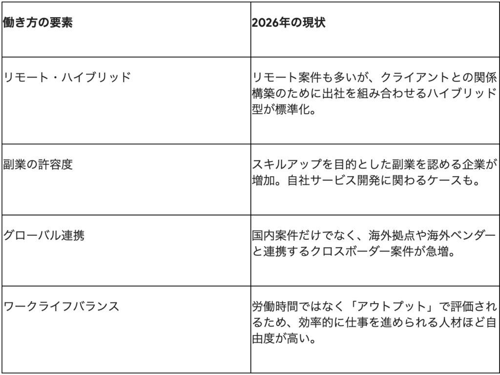 リモートワークの定着が進んだ2026年においても、ITコンサルタントの働き方は「柔軟性」と「成果への責任」のバランスが強く求められるようになっています。