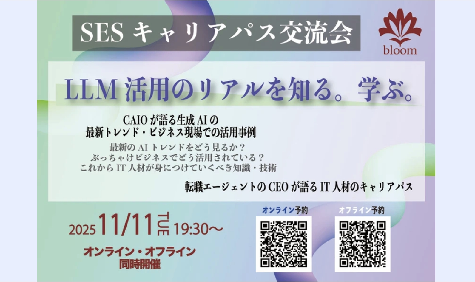 SES人材・年収アップの現実解|AIのリアルを知る。学ぶ。交流会 11月11日(火)に【SESキャリアパス交流会】を九段下、神保町にあるシェアオフィスBuD squareのラウンジで開催いたします。 《オフラインでご参加の方》 【開催日時】2025年11月11日(火)19:30〜21:30 【開催場所】東京都千代田区神田神保町3-27-7 Takebashi7 5F 神保町駅より徒歩4分、九段下駅より徒歩4分 Google Map:https://maps.app.goo.gl/H3xeTo5UmdKyHhGH6 【参 加 費】無料 【持ち物】名刺 オフライン予約フォーム: https://liff.line.me/2006263688-KVanajEB?liff_id=2006263688-KVanajEB&group_id=148559 《オンラインでご参加の方》 【開催日時】2025年11月11日(火)19:30〜21:00 【開催場所】オンライン開催:Google meet(ご予約いただいた方にURLをお送りいたします。) 【参 加 費】無料 ご参加時の、カメラのオンオフは任意とさせていただきます。 オンライン予約フォーム: https://liff.line.me/2006263688-KVanajEB?liff_id=2006263688-KVanajEB&group_id=148513 特定の企業や技術に偏らない「転職エージェント」という第三者的・俯瞰的なポジションから、IT市場全体を客観的にお話します。現場のエンジニアや一企業の人事からは見えにくい、市場全体のリアルな需給バランスや、今本当に評価されるキャリアの描き方を知ることができます。 ◇転職エージェントのCEOが語るIT人材のキャリアパス ・IT業界のトレンド ・IT人材の中期的なキャリアパス ・ITコンサルをはじめとするIT業界の転職事情 ◇CAIOが語る生成AIの最新トレンド ・ビジネス現場での活用事例・最新のAIトレンドをどう見るか? ・ぶっちゃけビジネスでどう活用されている? ・これからIT人材が身につけていくべき知識・技術 ■登壇者 <bloom株式会社 代表取締役CEO 林 栄吾> 慶應義塾大学卒業後、ベイカレント・コンサルティングを経て現職。 ベイカレント在籍には下記の業務に従事 リクルーティング:採用責任者として採用戦略策定から採用活動を実行 HR:組織の人事制度設計、及び人事評価 セールス:マネジメント層向けにコンサルティングサービスの提案を実施 デリバリー:新規事業策定、組織設計、AI活用等の戦略系プロジェクトに従事 <bloom株式会社 CTO兼CAIO 上山 卓真> 慶應義塾大学を卒業後、株式会社SELTECHに入社。 営業兼プロジェクトマネージャーとして、組み込み開発案件の推進に尽力。 その後、株式会社ARISE analyticsに参画。データサイエンティスト・AIエンジニア組織のマネジメントを担うとともに、データ・AIコンサルティング事業部門の副事業部門長を歴任。数多くのデータ・AI活用推進プロジェクトを手掛けた経験を活かし、現在はbloom株式会社のCTO兼CAIOとして、技術活用を横断的に推進し事業貢献を牽引している。 オフラインでご参加の方は、会場にて、 お菓子やおつまみ、ドリンク(アルコールを含む)をご用意しております。楽しく皆さまと交流できる場になればと思います🍻 オフライン予約フォーム :https://liff.line.me/2006263688-KVanajEB?liff_id=2006263688-KVanajEB&group_id=148559 オンライン予約フォーム: https://liff.line.me/2006263688-KVanajEB?liff_id=2006263688-KVanajEB&group_id=148513 過去イベントレポート🔗【開催レポート】未来のキャリアを拓く!IT人材交流会でAIとキャリアの最前線に迫る