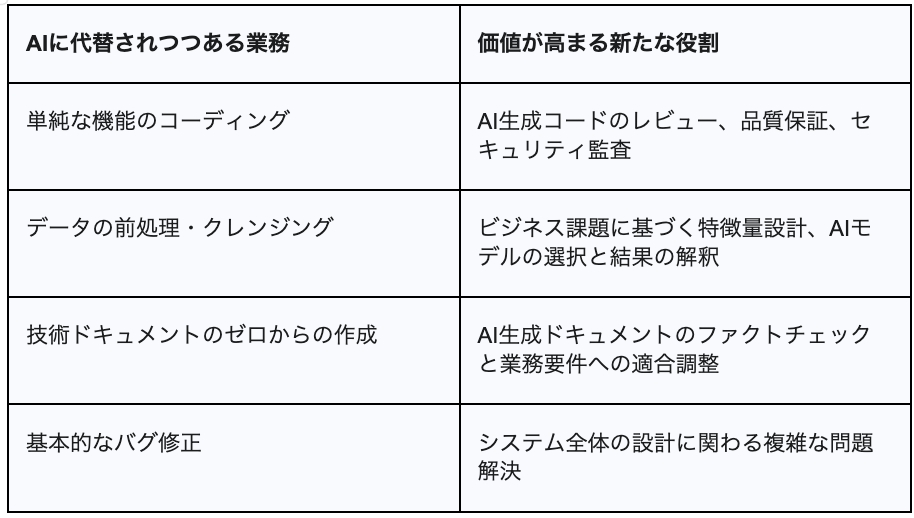 一方の極では、価値が相対的に低下しつつある業務領域があります。具体的には、AutoML(自動機械学習)ツールなどの進化によってコモディティ化が進む、定型的なデータの前処理や特徴量エンジニアリング、基本的なモデル構築といった作業です。これらの業務は、AIツールが得意とする領域であり、代替が進むのは避けられないでしょう。