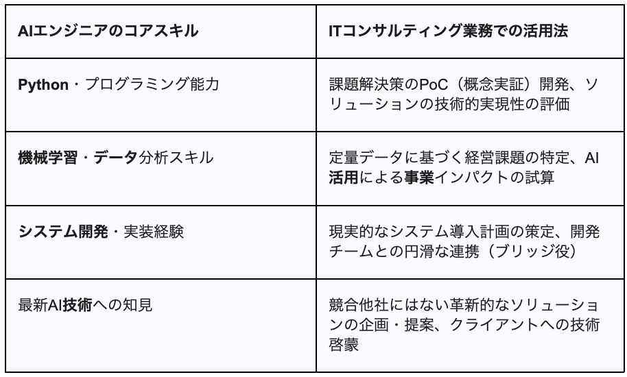 AIエンジニアが持つスキルが、ITコンサルティング業務でいかに強力な武器になるかを以下の表に示します。