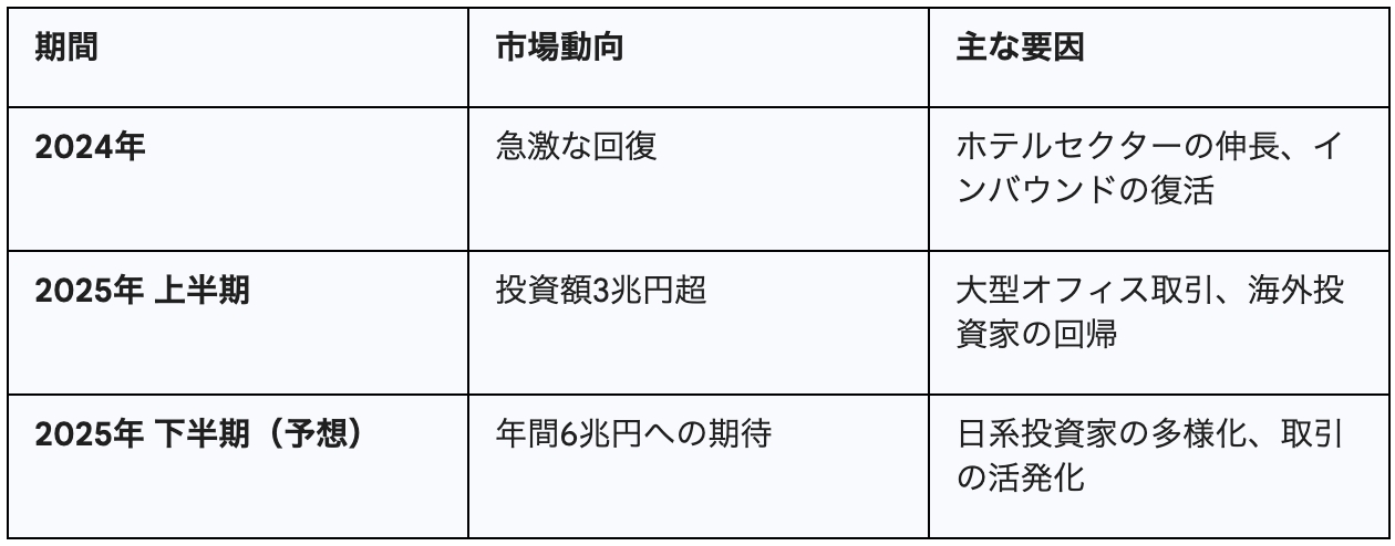 現場のアセットマネージャーが「忙しい」と口にする最大の理由は、皮肉なことに市場が「好調すぎる」ことにあります。不動産投資市場は、金利動向や地政学リスクへの懸念を跳ねのけ、2024年から2025年にかけて力強い回復を見せています。