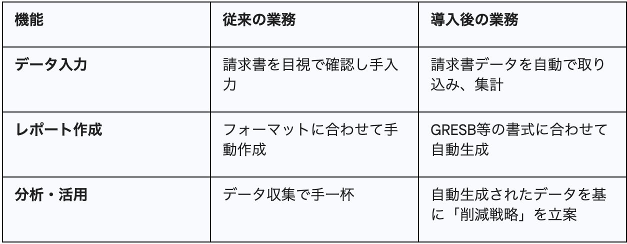 - レポーティング: 収集したデータを分析し、投資家向けのレポートやGRESB申請書類を作成する。