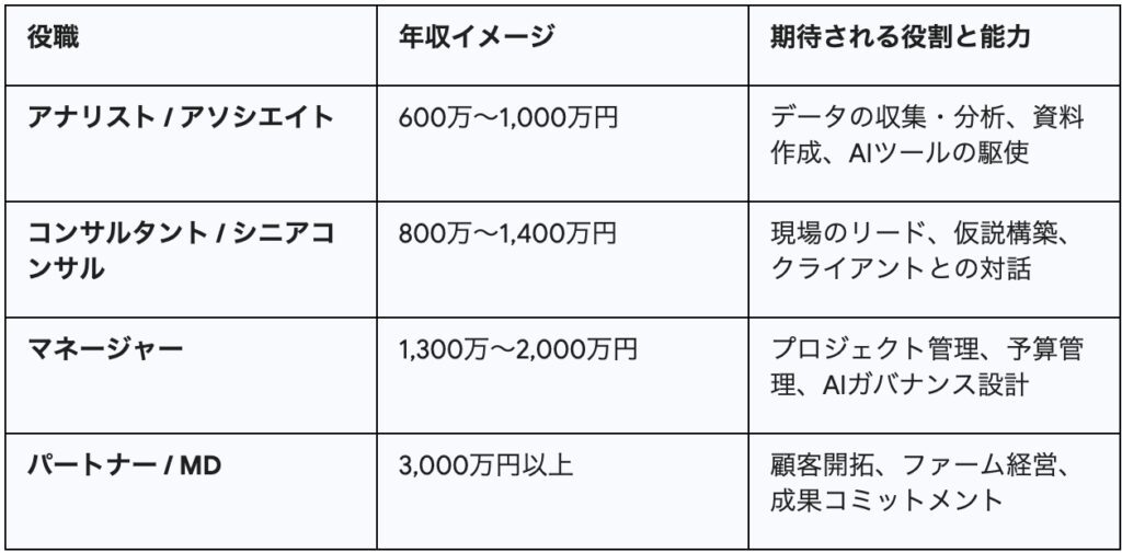 2026年における大手コンサルティングファームの年収相場は以下の通りです。