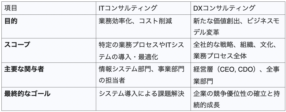DXコンサルティングとITコンサルティングは、どちらもITを活用する点で共通していますが、その目的とスコープにおいて根本的な違いがあります。この違いを理解することは、キャリアを考える上で非常に重要です。