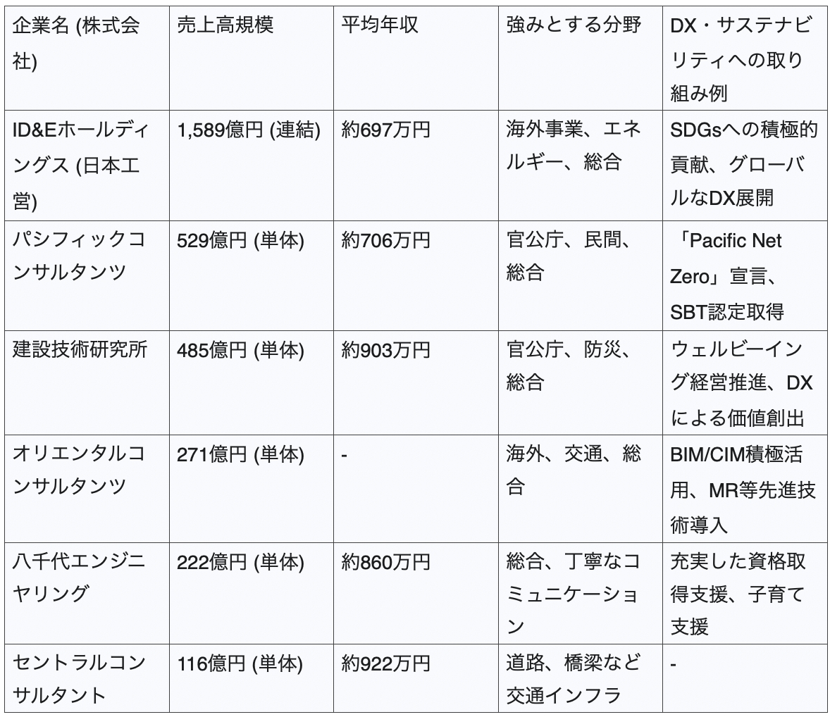 以下に、主要な建設コンサルタント企業の特徴を一覧でまとめました。売上高や平均年収といったデータに加え、各社が強みとする分野や、DX・サステナビリティへの取り組みを比較することで、より立体的に企業を理解することができるでしょう。