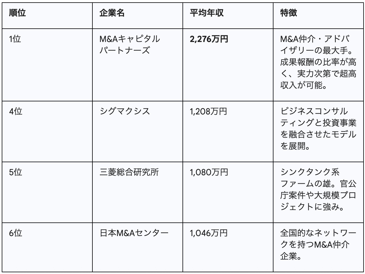 以下の表は、最新のデータに基づくコンサルティング業界の平均年収ランキングの一部です。