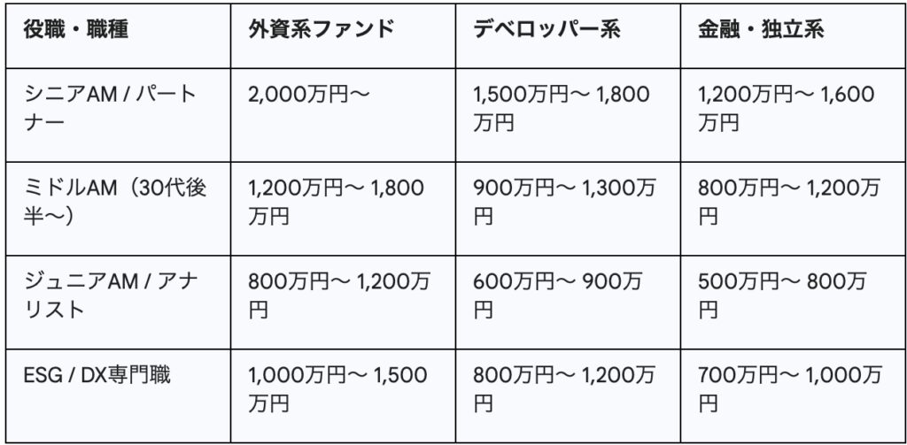 2026年 不動産AM業界の役職別年収目安(推計)