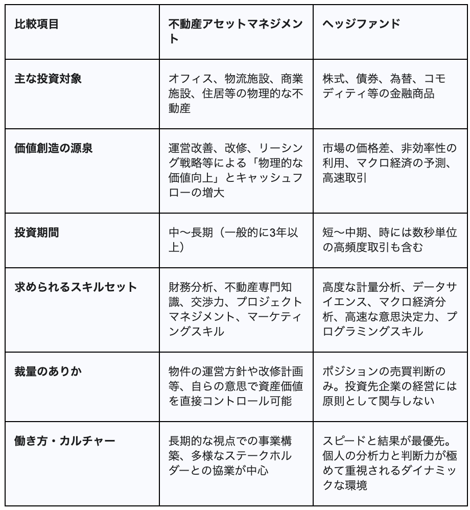 ヘッジファンドが金融市場のダイナミズムの中で知的な挑戦を続けるキャリアであるならば、不動産アセットマネジメントは、金融の知見と事業家としての実行力を融合させ、現実世界に確かな価値を創造していくキャリアです。