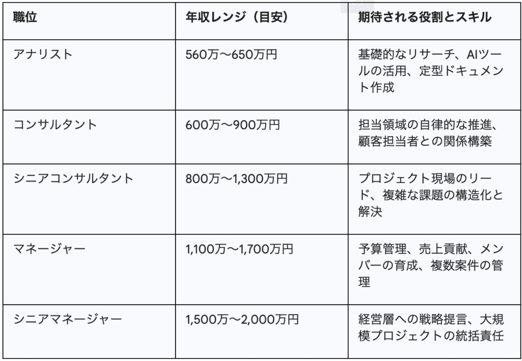 コンサルティングファームにおける年収は、明確に定義された職位(ランク)に基づいて決定されます。以下の表は、2026年の市場における一般的な年収レンジを示したものです。