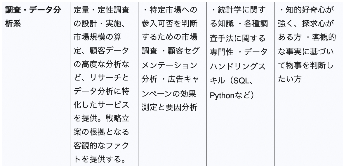 - 売上・企業価値の向上: クライアントが提供する商品やサービスの売上を最大化し、ブランド価値を高めることが最も重要な役割です。市場調査や競合分析を通じて、効果的なマーケティング戦略を策定・実行し、クライアントの市場シェア拡大に直接的に貢献します。