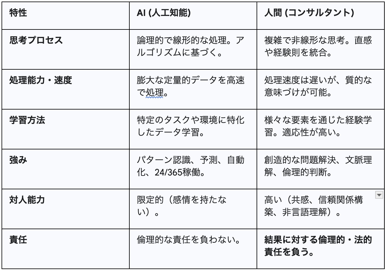 AIの能力が向上する中で、「コンサルタントの仕事は奪われるのか」という議論が絶えませんが、結論から言えば、仕事は「奪われる」のではなく「変化」し、そして新たに「生まれる」ものです。AIと人間には明確な得意・不得意の領域があり、これらを理解した上で役割分担を最適化することが重要です。