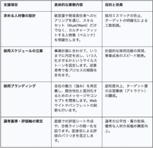- 実行支援: 実際の面接官トレーニングや、採用ピッチ資料の作成、母集団形成(集客)の施策を実行します。