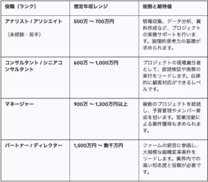 以下の表は、一般的な組織人事・採用コンサルタントの年収目安です。