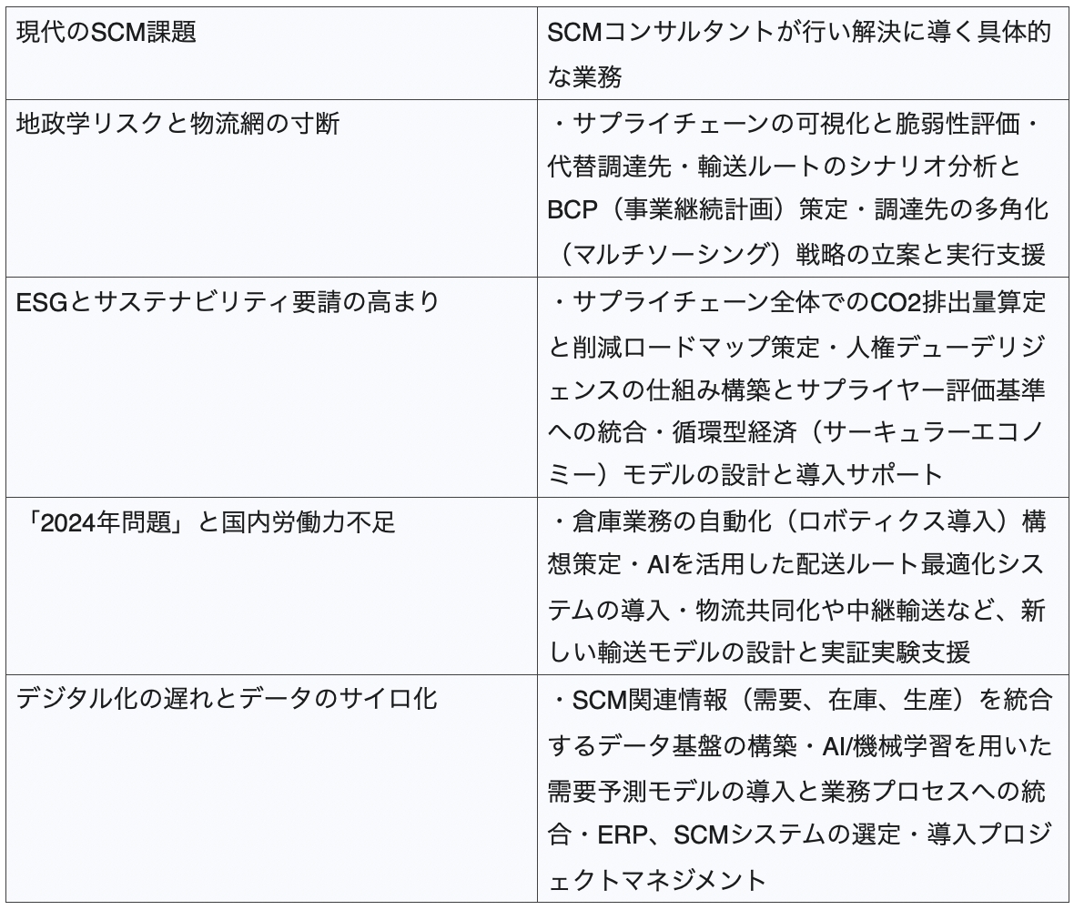 これらの業務は、現代企業が直面する喫緊の課題を解決するために行われます。以下の表は、主要なSCM課題と、それに対してコンサルタントが提供する具体的な解決策の事例をまとめたものです。