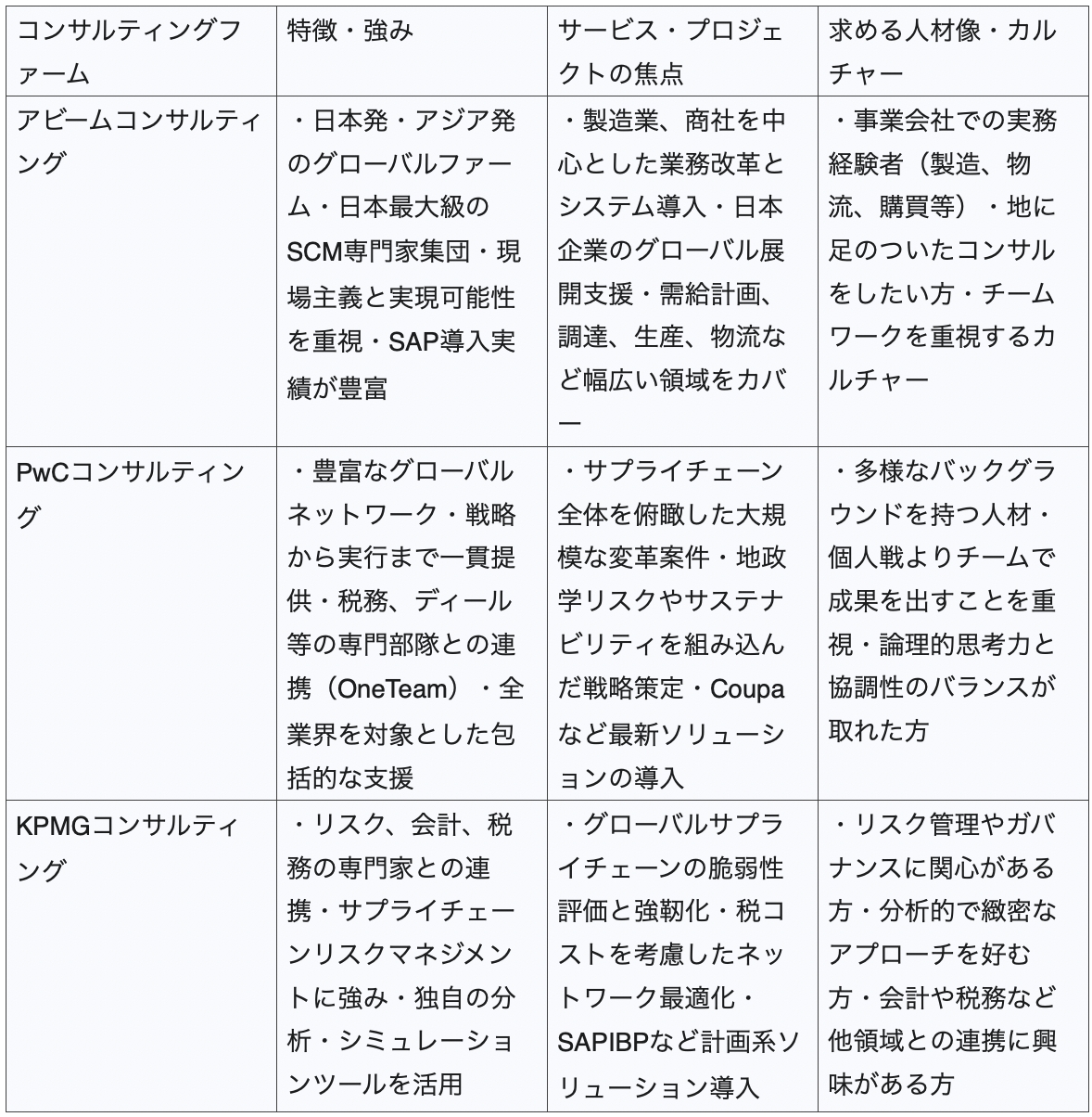 SCMコンサルティングを提供するファームは数多くありますが、それぞれに強みやカルチャーが異なります。ここでは代表的な3社の特徴を比較紹介します。