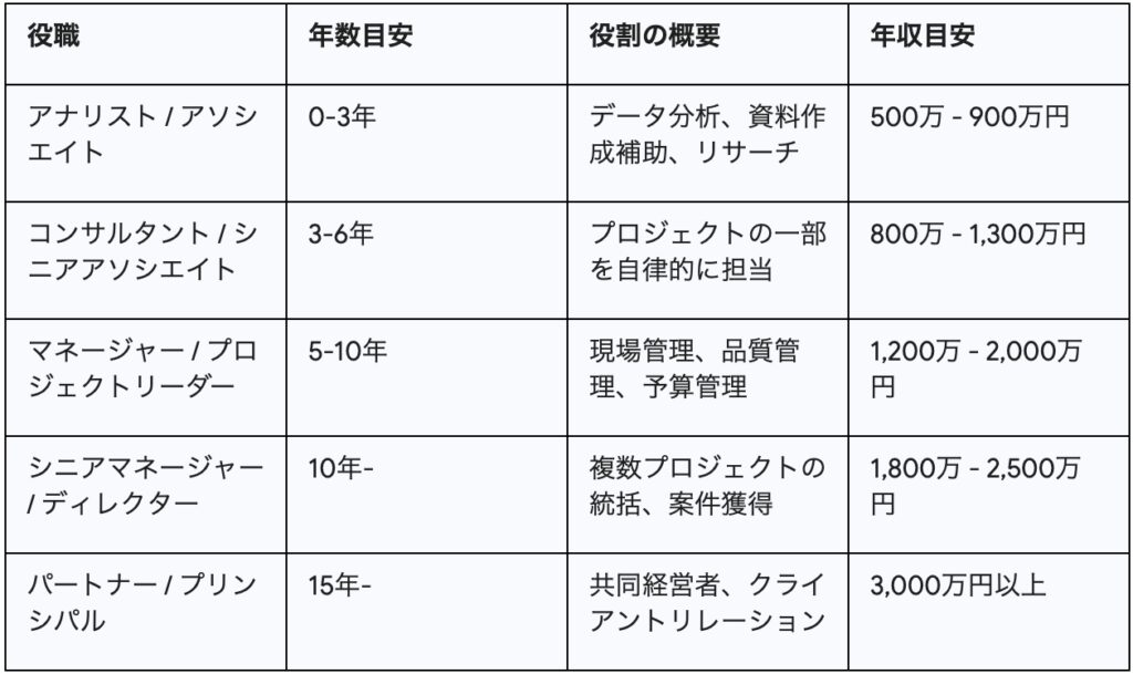 コンサル業界は徹底した実力主義の階層構造を持っており、役職が上がるごとに責任範囲と報酬が飛躍的に増大します。20代・第二新卒で入社する場合、多くは「アナリスト」または「アソシエイト」という職位からスタートします。