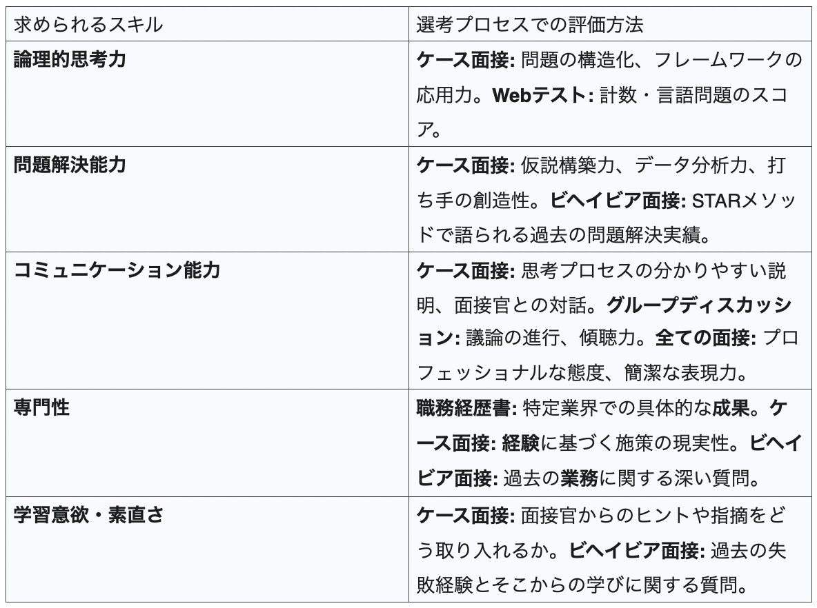 コンサルタントに求められる主要なスキルは、選考プロセスの各段階で多角的に評価されます。以下の表は、どのスキルが、どのように見られているかをまとめたものです。これを理解することで、各選考フェーズで何を意識すべきかが明確になります。
