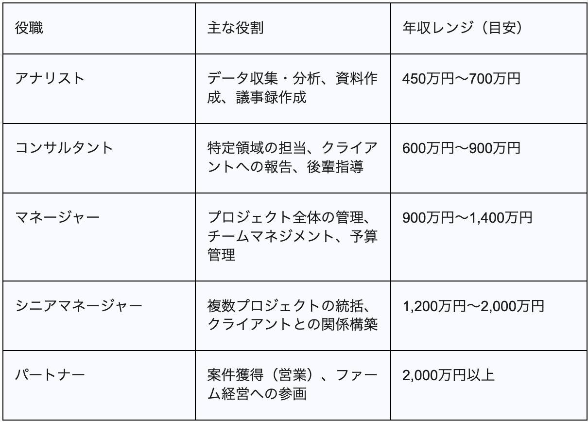 コンサルティングファームには、明確なキャリアパスが存在します。一般的に、以下の役職を階段のように昇進していきます。
