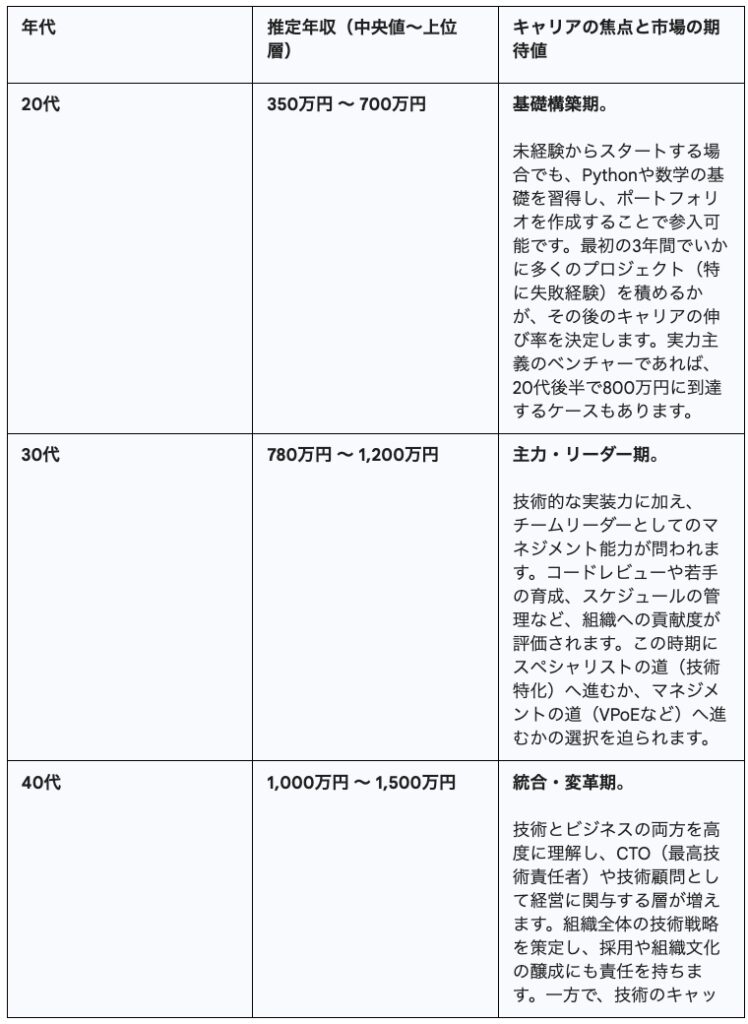AIエンジニアのキャリアパスは、経験年数とともに確実に市場価値が向上する傾向にあります。