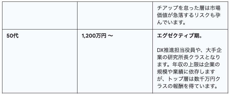 これまでの転職市場では「35歳限界説」などが囁かれることもありましたが、AI分野においては全く当てはまりません。むしろ、豊富な業務知識(ドメイン知識)とプロジェクト管理経験を持つ30代、40代、50代の人材こそが、AIをビジネス現場に定着させるためのキーパーソンとして再評価されています。データによれば、40代で1,000万円以上、50代で1,200万円以上の年収を得ているAI人材も珍しくなく、経験が正当に評価される土壌が整いつつあります。