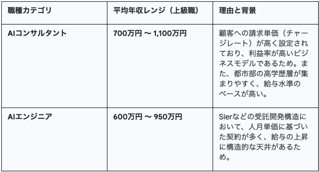 統計的な中央値や平均値で比較した場合、軍配は明確に「AIコンサルタント」に上がります。