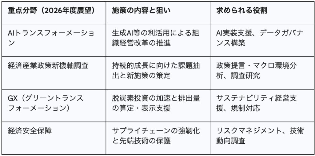 シンクタンクの業務は多岐にわたりますが、官民連携の観点では以下の3つの分野が中核となります。