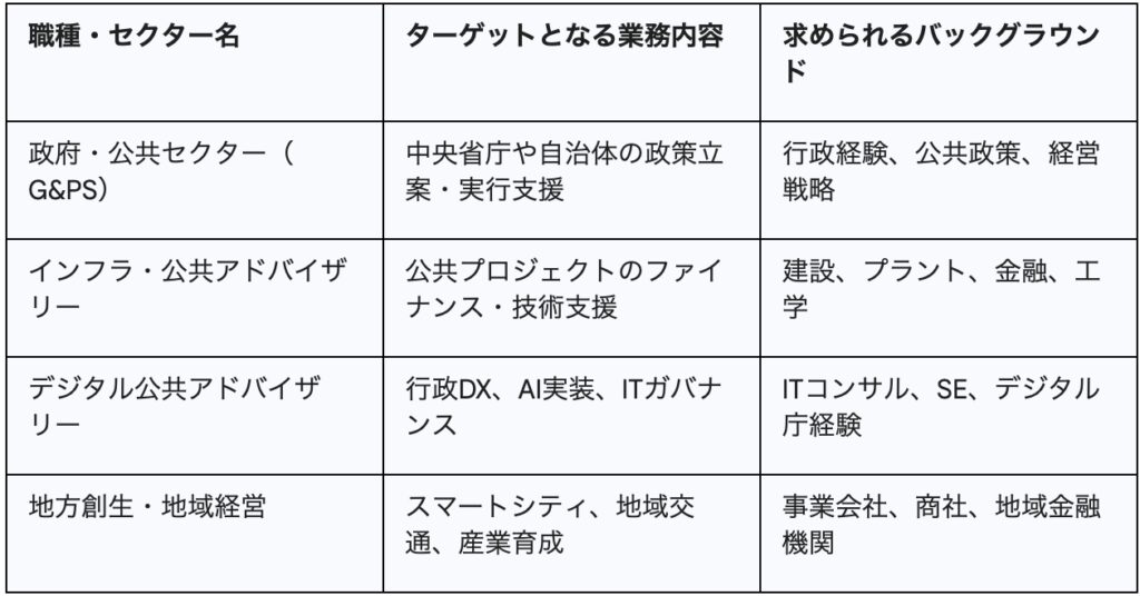 • 理由: 行政組織も今、民間並みの効率性やデジタル化を求めています。事業会社でのDX推進、金融機関でのファイナンス知識、IT企業でのシステム構築経験などは、コンサルティングファームのパブリックセクター部門でそのまま活かせるポータブルスキルです。
